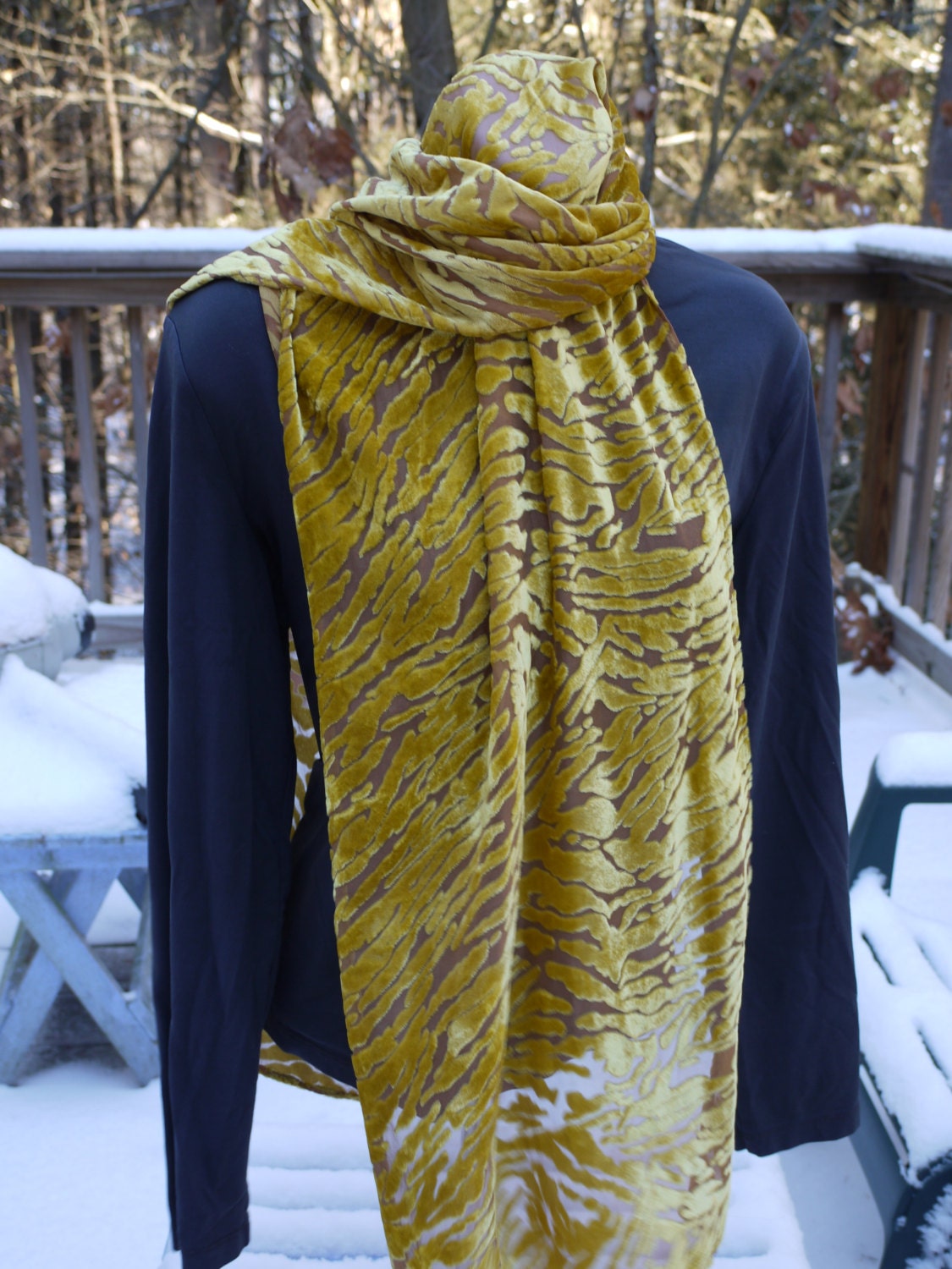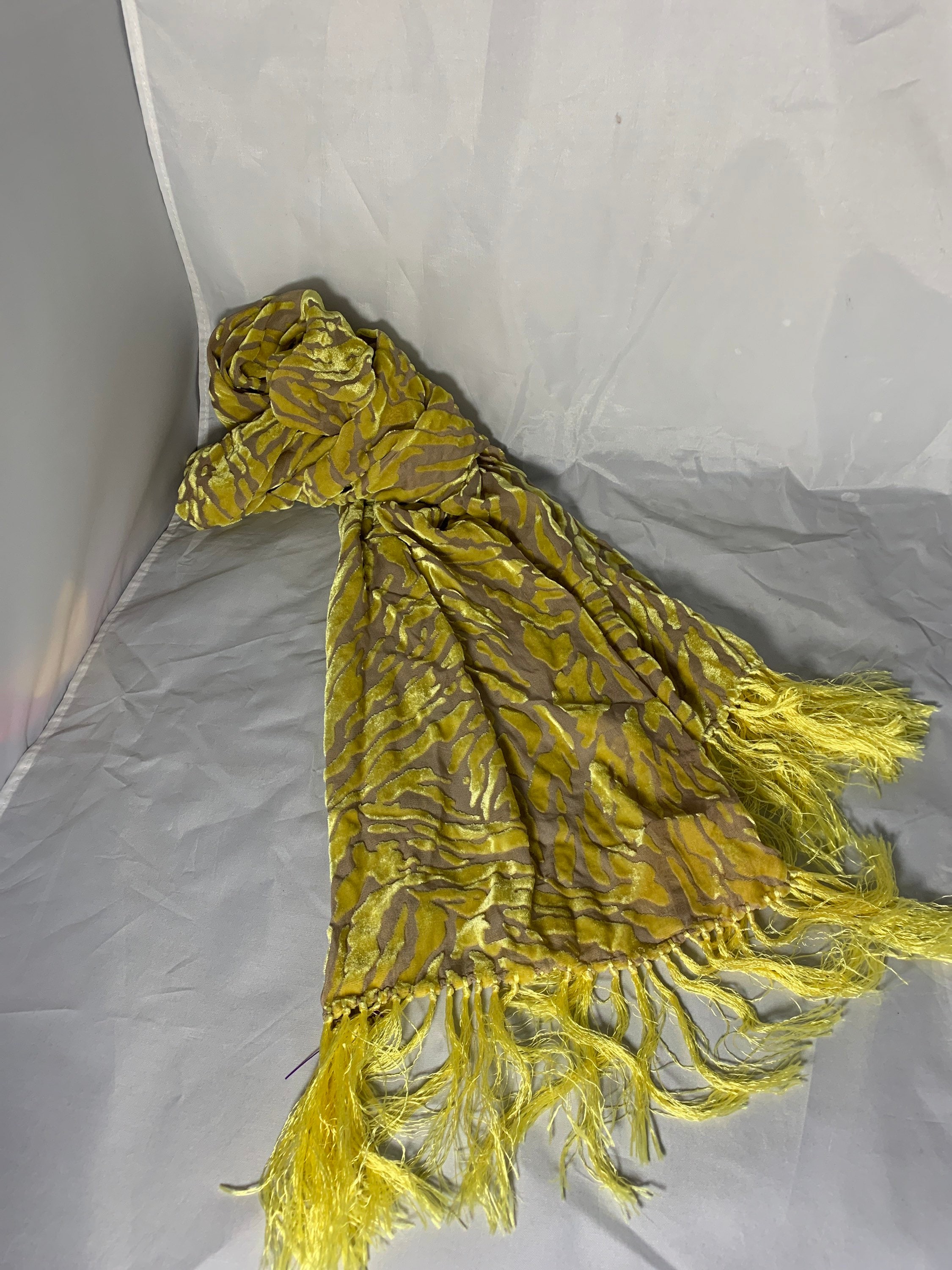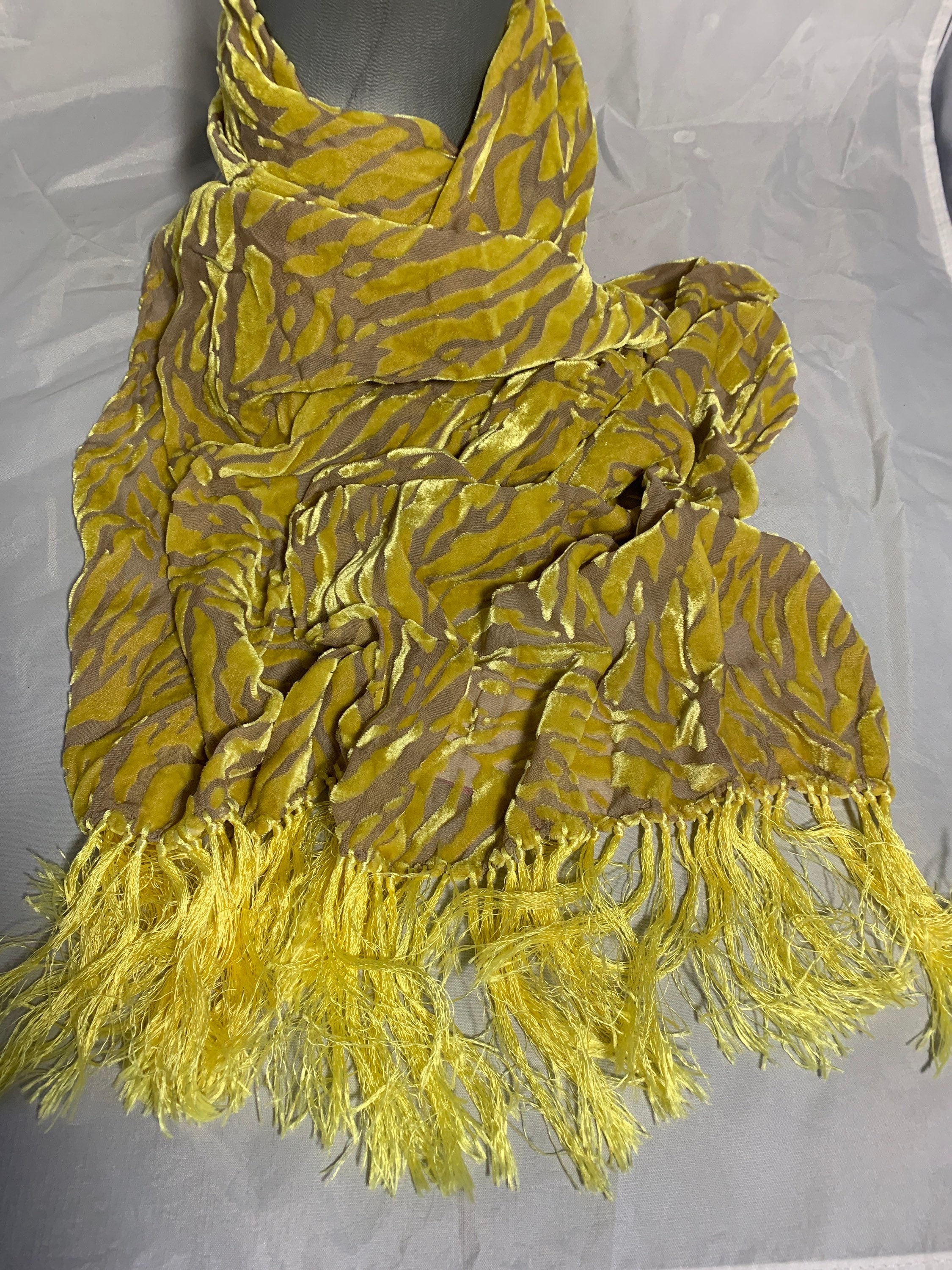 Medium weight silk velvet scarf in a wild animal print design. Super soft and has a great drape. This scarf has hand rolled hems and a 3” silk fringe. Dyed with gold color acid wash dye. Great under a coat or as a fashion accessory. Scarf measures 14" wide by 72" long. Makes a cute shawl as well.